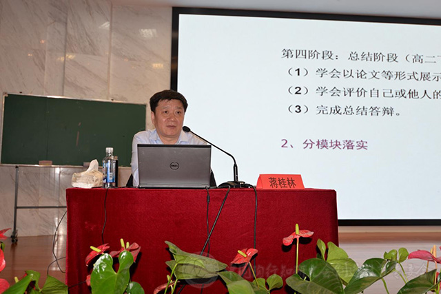 5月22日下午,南京市第一中学副校长蒋桂林为大家作了《传承与创新——综合实践课程实施谈》的讲座。蒋校长介绍了学校的研究性学习、职业体验、慈善行走、朗诵社团等特色综合实践课程。
